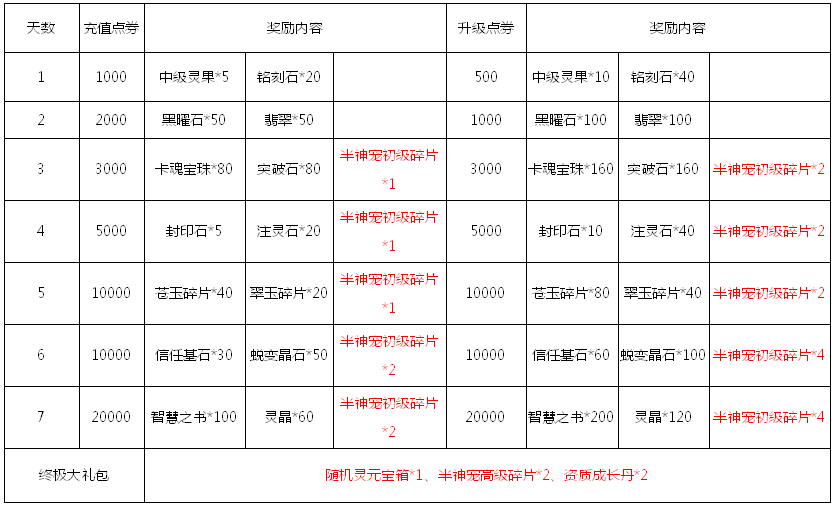 活动规则:每日充值对应数额点券即可获得对应奖励,完成7天连续对应天数充值条件还可触发终极大礼包。