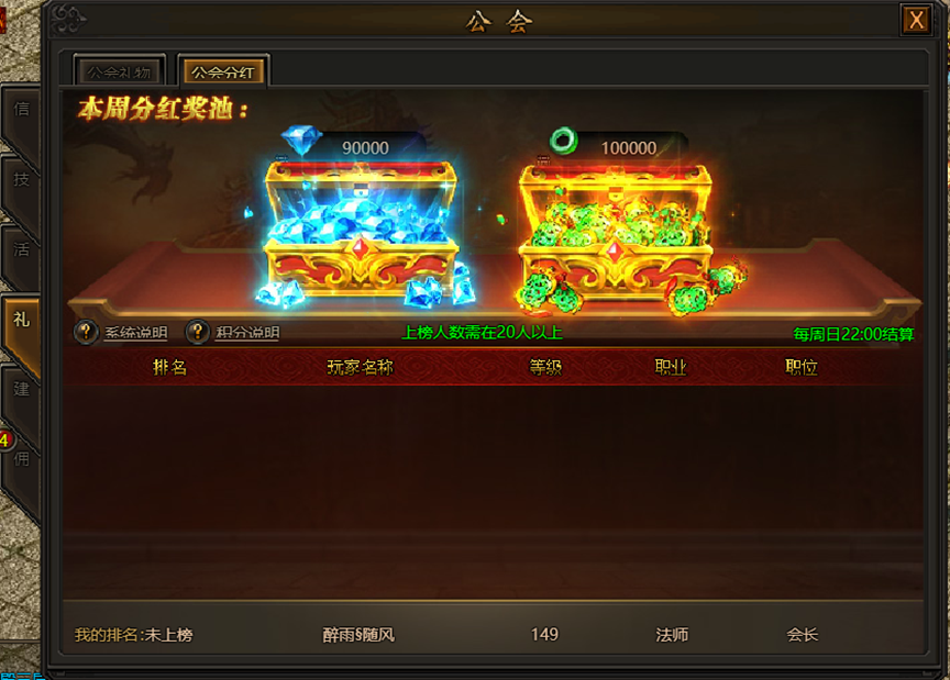 - 系统开放:开服90天,角色等级90级,转生10级,可从【公会-礼物-公会分红】处进入系统;