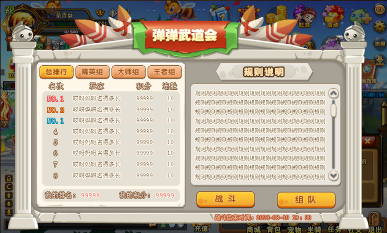 1、武道会新增决赛玩法,周六预赛结束2小时后公布决赛门票名单,决赛需提前在页面中邀请好友组队,战斗开始后无法邀请队友与无法更换队友;