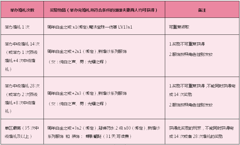 5,单次结婚奖励在您完成婚礼后立即发放到您的邮箱,结婚次≥14,28,35的奖励,装饰物品将在活动结束5-7个工作日发放,节假日顺延哦。