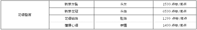 中级婚礼(原价:32000点券,折后:16000点券)可获得:婚礼捧花*1、婚礼邀请喇叭*1、情定终生+1*1、金玉良缘称号卡*1(各属性+20)