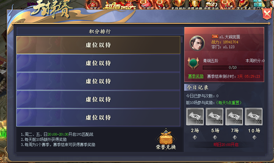 每周为一个赛季,赛季结束后可获得赛季奖励战功
