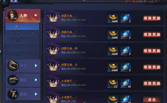 完成对应的成就内容(升级,击杀BOSS,等等)会获得对应的元宝和灵石奖励