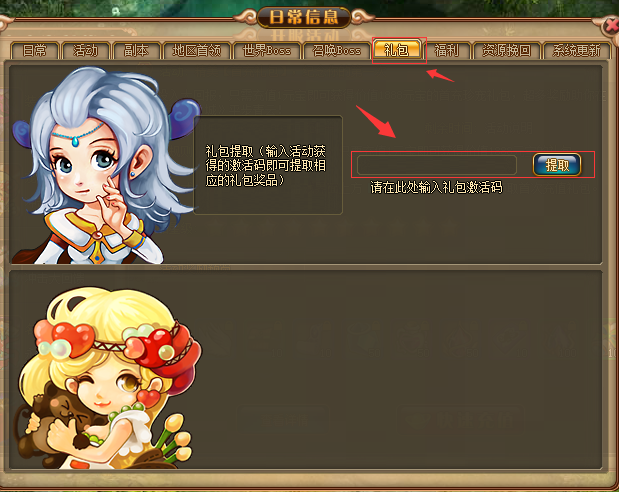 打开活动大厅图标,点击礼包栏输入对应激活码,兑换提取礼包,直接到背包