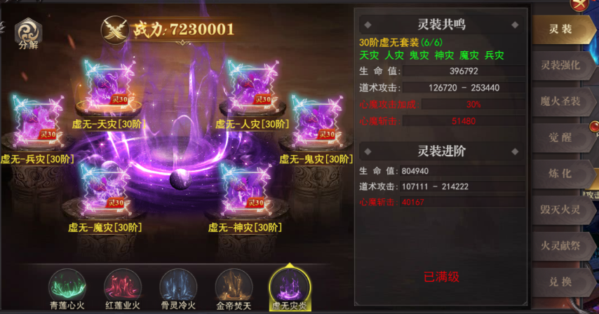 金帝焚天和虚无灾炎灵装碎片和强化石通过心魔献祭获取