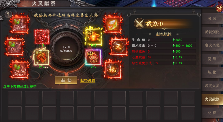 灵装强化:需要对应魔火灵装部位全部强化满阶可以进行献祭