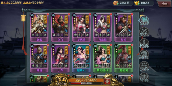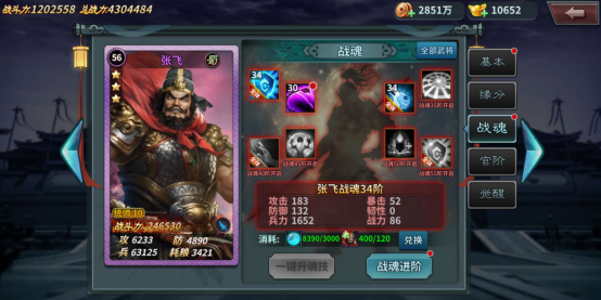 前面升战力,有两个捷径,一个是不断的获得武将,君威等级升高,从而战力提升。第二个就是升战魂,尤其是像下图的全攻、全防、全兵等,其中全兵又是升战力最多的。