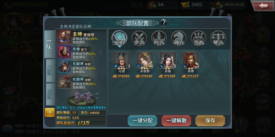 可以从图中的介绍看到,前五将战斗力越大,国战中部队的战力也越强。刚开始玩,你最需要的就是不断在国战中刷战功,因为战功可以得到很多你需要的武将,如马超,黄忠等武将。