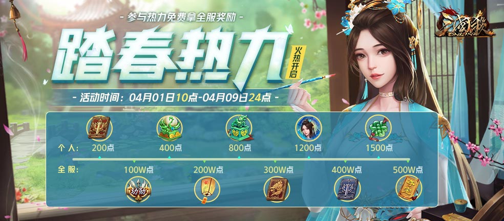 | 4月9日0点-4月9日24点 | 踏青普通武将礼包 | 1600通用元宝 | 手气卡*1、普通武将包*4 | 累计限购1个,不可赠送,不可使用抵价券 |