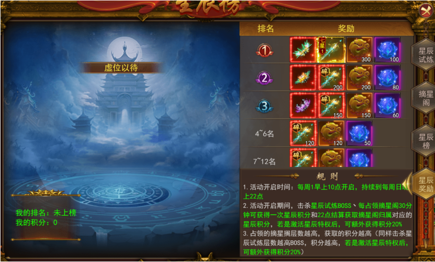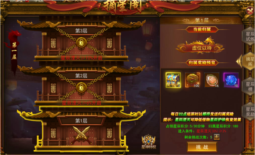 (2)占领的摘星搁层数越高,获取的积分越高(同样击杀星辰试炼层数越高B0SS,积分越高,若是激活星辰特权后,可额外获得积分20%)