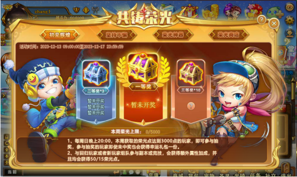2、初见辉煌:与回归玩家或者新玩家共同参与竞技或副本均可获得荣光点,荣光点可以用于荣光商店购买。每周获取的荣光点达到一定点数的玩家均可参与周末的本区抽奖。