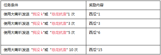 1、在活动期间使用大喇叭发送“"我没k"或 "恐龙抗浪"即可获得西瓜兑换道具;